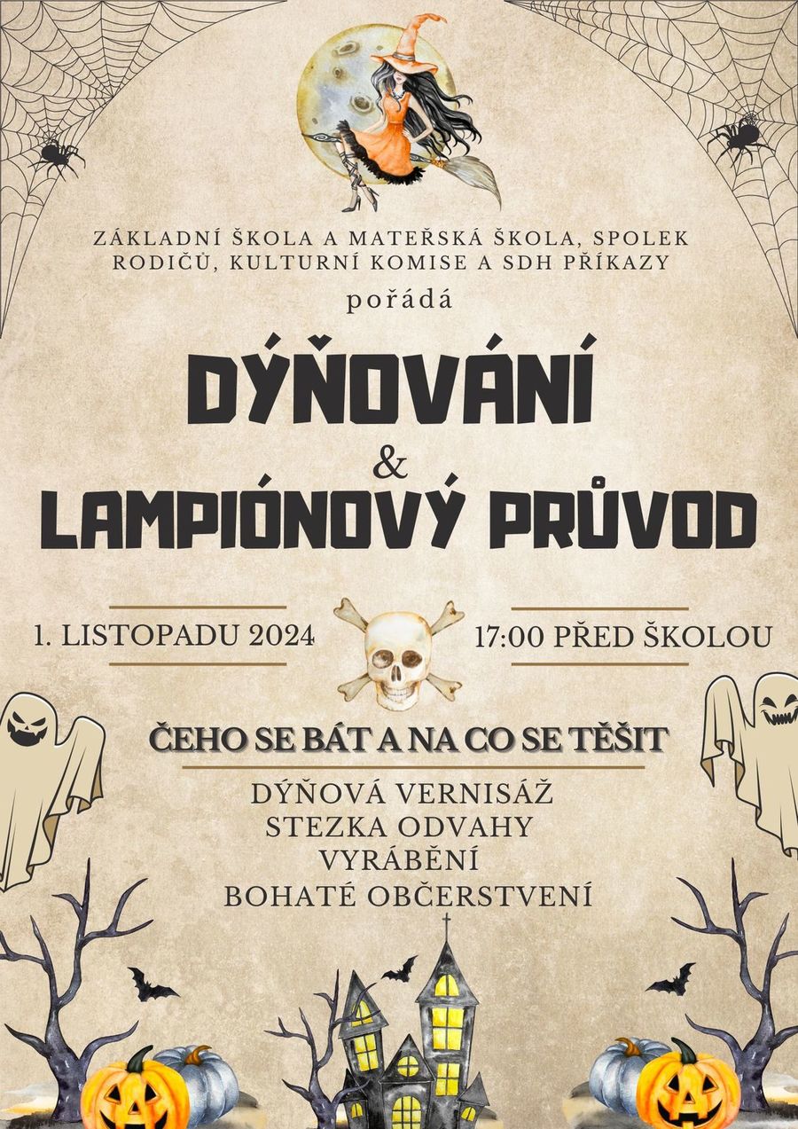 v pátek 1. listopadu pořádá ZŠ a MŠ Příkazy Dýňování s lampiónovým průvodem. Sraz na lampiónový průvod je v 17.00 před budovou školy. Poté bude následovat program v areálu TJ Sokola Příkazy, kde se můžete těšit na občerstvení, dílničky, dýňovou vernisáž či stezku odvahy.