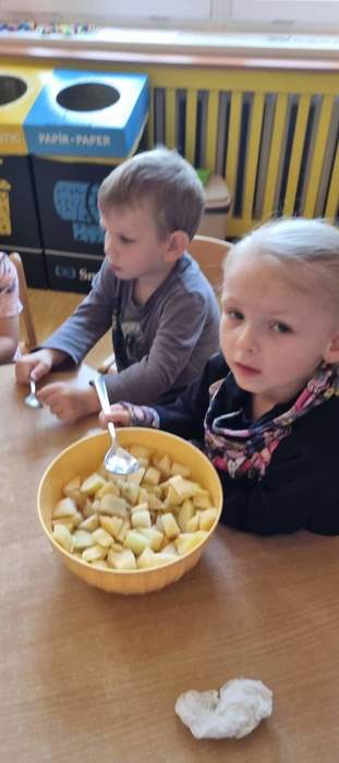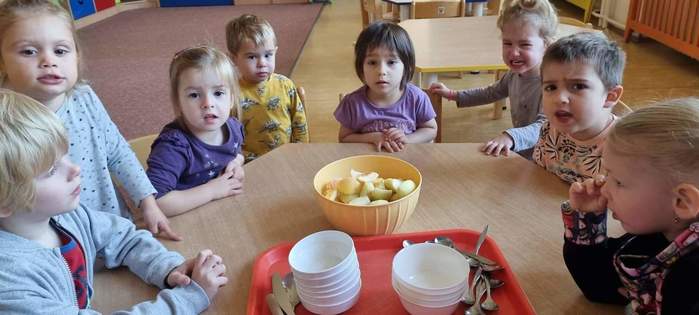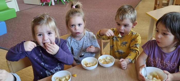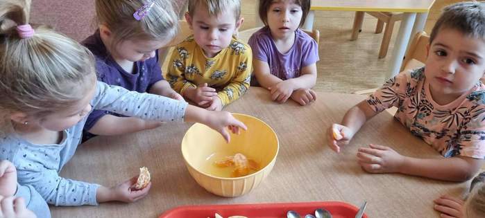 Děti ze třídy Želviček si nacvičovaly polytechnickou výchovou dovednost krájení kulatým nožem, strouhání na struhadle a míchání a vytvořily si vitamínovou bombu v podobě ovocného salátu. Bacily nás nezastaví :-)